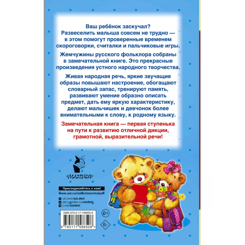 Скороговорки, считалки и игры для развития речи. Ваш ребёнок заскучал? Развеселить малыша совсем не трудно - в этом вам помогут проверенные временем скороговорки, считалки и пальчиковые игры. Маленького непоседу ждёт множество развлечений. Можно, например, соревноваться, кто быстрее произнесёт скороговорку, или отгадывать, какое животное малыш показал при помощи пальчиков. А определить, кто будет водить в подвижных играх, позволят весёлые считалки. Скороговорки, считалки и пальчиковые игры, собранные в книге, - это не только способ развлечь малыша, но и полезнейшее упражнение для развития речи. Произведения народного творчества пробуждают фантазию малыша, любовь к родному языку. Совместные занятия - отличный способ установить доверительные отношения с ребёнком.