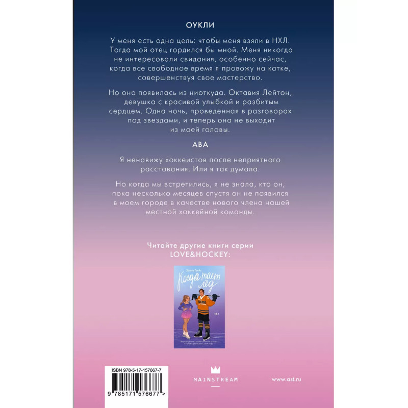 Счастливый удар. - Романтическая история для поклонников Эль Кеннеди и Кендалл Райан. - От автора бестселлеров Amazon. - Красавец Оукли мечтает попасть в НХЛ, но Ава терпеть не может хоккеистов. Что получится из их отношений? - Вы влюбитесь в своенравного и амбициозного хоккеиста с первого взгляда - совсем как главная героиня, хоть она это и отрицает. - Увлекательный роман в духе историй "от ненависти до любви". Остроумные диалоги, взрывные эмоции и незабываемые герои.