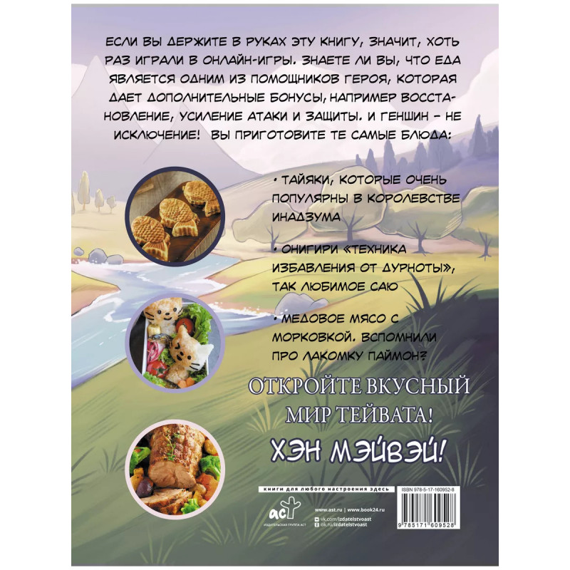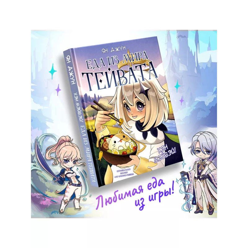Хэн мэйвэй! Еда из мира Тейвата. Неофициальное издание для фанатов Геншина. Не можете жить без онлайн-игр? Тогда держите кулинарную книгу, созданную по удивительным мирам Тейвата! Книга Ян Джун "Хэн мэйвэй! Еда из мира Тейвата. Неофициальное издание для фанатов Геншина" подарит вам полное погружение во вселенную популярной онлайн-игры. Почувствуйте себя на одной волне с любимыми героями - приготовьте необычные блюда по причудливым рецептам и поднимите настроение себе и процент выносливости вашим персонажам. Вас ждут невероятные рецепты супов, суши, салатов, мяса и закусок из мира Тейвата: сочный стейк, который можно купить у повара Брук, способный воскресить героя; рыбный шашлык для восстановления здоровья, который обожает Диона; мясные голубцы с грибами, которые подают на постоялом дворе "Ваншу"; "Деликатесы скалистой гавани", символизирующие благоухание земли, прохладу тени и влажность тумана, и праздничный сок, способный вылечить целый отряд. Не нужно быть профессиональным поваром - благодаря пошаговым инструкциям приготовить блюда сможет даже новичок, а аппетитные фотографии, ярк