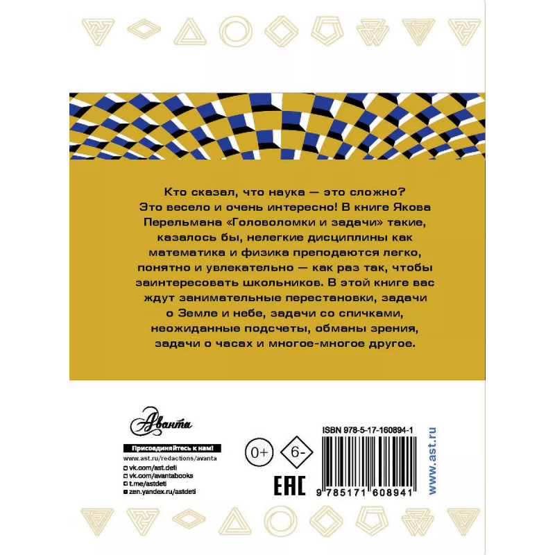 Головоломки и задачи. В книге Якова Перельмана "Головоломки и задачи" более сотни занимательных заданий для развития интеллекта, мышления и логики. Они могут показаться простыми только на первый взгляд, однако разгадать их не всегда получается даже у взрослых! На страницах этого издания вас ждут загадочные перестановки, обманы зрения, задачи со спичками, числовые головоломки и еще множество интересных задач, позволяющих закрепить знания из области математики, физики, геометрии и географии. Для среднего школьного возраста.