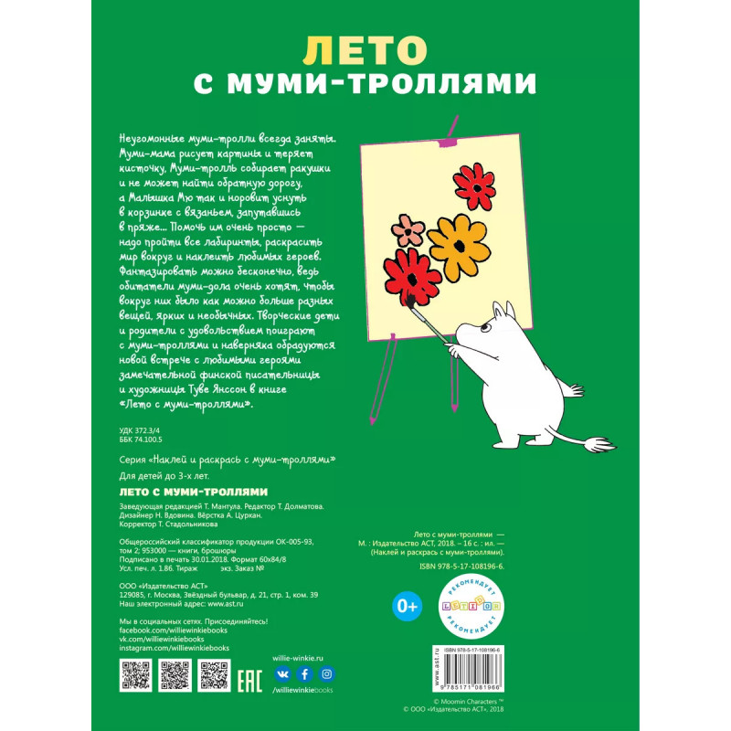 Лето с муми-троллями. Редакция "Вилли Винки" представляет! Неугомонные муми-тролли всегда заняты. Муми-мама рисует картины и теряет кисточку, Муми-тролль собирает ракушки и не может найти обратную дорогу, а Малышка Мю так и норовит уснуть в корзинке с вязаньем, запутавшись в пряже... Помочь им очень просто - надо пройти все лабиринты, раскрасить мир вокруг и наклеить любимых героев. Фантазировать можно бесконечно, ведь обитатели муми-дола очень хотят, чтобы вокруг них было как можно больше разных вещей, ярких и необычных. Творческие дети и родители с удовольствием поиграют с муми-троллями и наверняка обрадуются новой встрече с любимыми героями замечательной финской писательницы и художницы Туве Янссон в книге "Лето с муми-троллями".