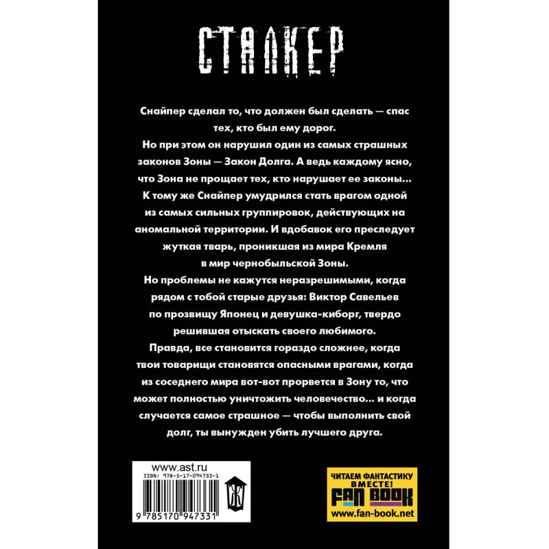 Закон долга. Снайпер сделал то, что должен был сделать - спас тех, кто был ему дорог. Но при этом он нарушил один из самых страшных законов Зоны - Закон Долга. А ведь каждому ясно, что Зона не прощает тех, кто нарушает ее законы... К тому же Снайпер умудрился стать врагом одной из самых сильных группировок, действующих на аномальной территории. И вдобавок его преследует жуткая тварь, проникшая из мира Кремля в мир чернобыльской Зоны. Но проблемы не кажутся неразрешимыми, когда рядом с тобой старые друзья: Виктор Савельев по прозвищу "Японец" и девушка-киборг, твердо решившая отыскать своего любимого. Правда, все становится гораздо сложнее, когда твои товарищи становятся опасными врагами, когда из соседнего мира вот-вот прорвется в Зону то, что может полностью уничтожить человечество... и когда случается самое страшное - чтобы выполнить свой долг ты вынужден убить лучшего друга.
