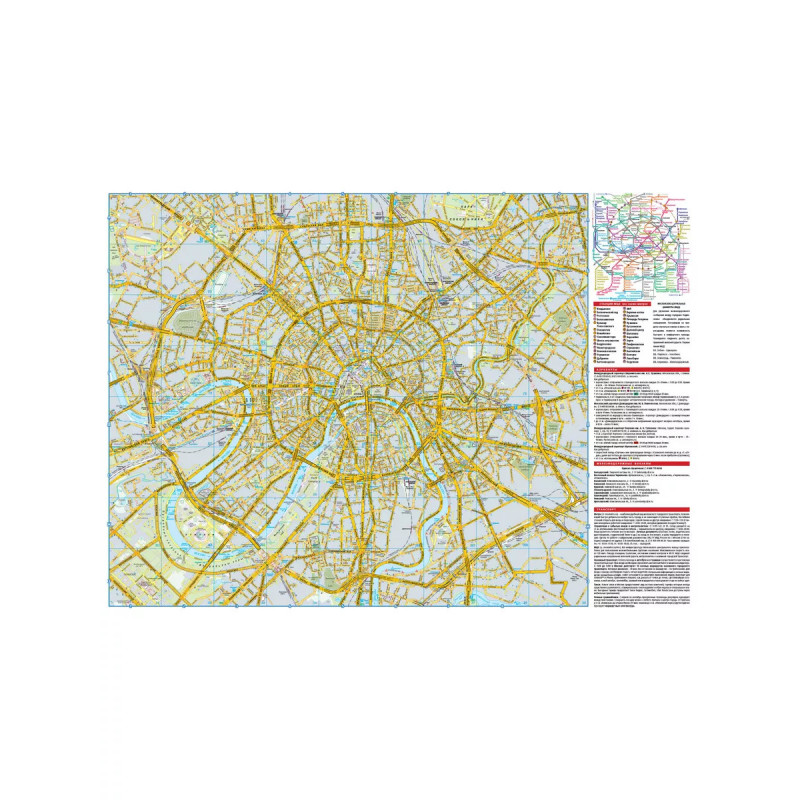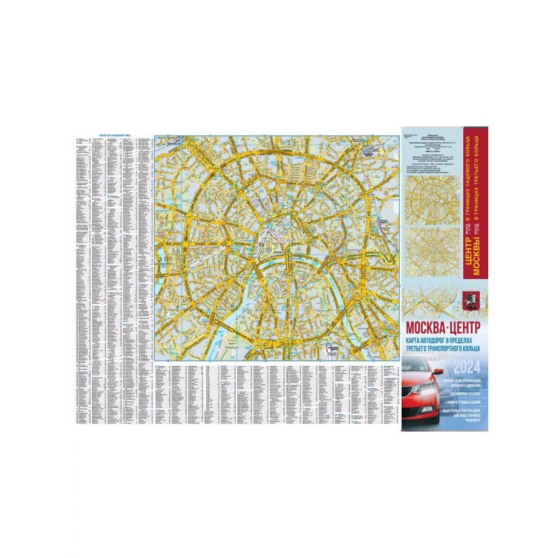 Москва. Центр. Карта автодорог в пределах третьего транспортного кольца. Двусторонняя карта автомобильных дорог центра Москвы. Формат 690х480мм, в сложенном виде 135х240мм В пределах Садового кольца масштаб 1:15000 В пределах Третьего транспортного кольцо 1:23000 На карте показаны: административные районы, магистрали, подробно показана дорожная сеть. Карта сопровождается указателем улиц. " Хорошая читаемость автомагистралей. " Полная схема организации движения " Светофорные объекты " Номера угловых домов " Выделенные участки дорог для общественного транспорта +схема метро Москвы Без навигатора найдете дорогу!