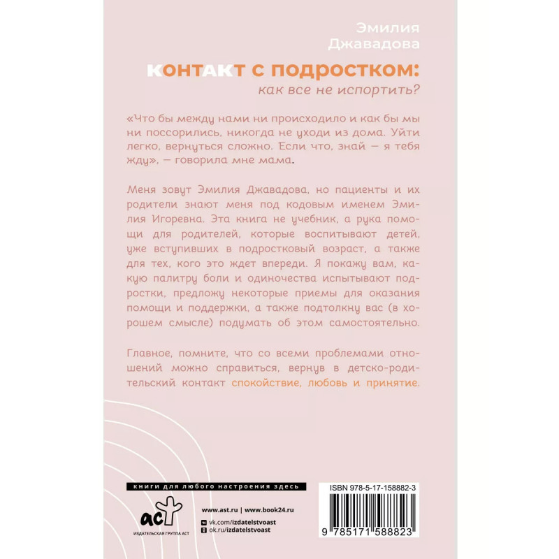 Контакт с подростком: как все не испортить. "Что бы между нами не происходило и как бы мы ни поссорились, никогда не уходи из дома. Уйти легко, вернуться сложно. Если что, знай - я тебя жду", - говорила мне мама. Меня зовут Эмилия Джавадова, но пациенты и их родители знают меня под кодовым именем Эмилия Игоревна. Этак книга не учебник, а рука помощи для родителей, которые воспитывают детей, уже вступивших в подростковый возраст, а также для тех, кого это ждет впереди. Я покажу вам, какую палитру боли и одиночества испытывают подростки, предложу некоторые приемы для оказания помощи и поддержки, а также подтолкну вас (в хорошем смысле) подумать об этом самостоятельно. Главное помните, что со всеми проблемами отношений можно справиться, вернув в детско-родительский контакт спокойствие, любовь и принятие.