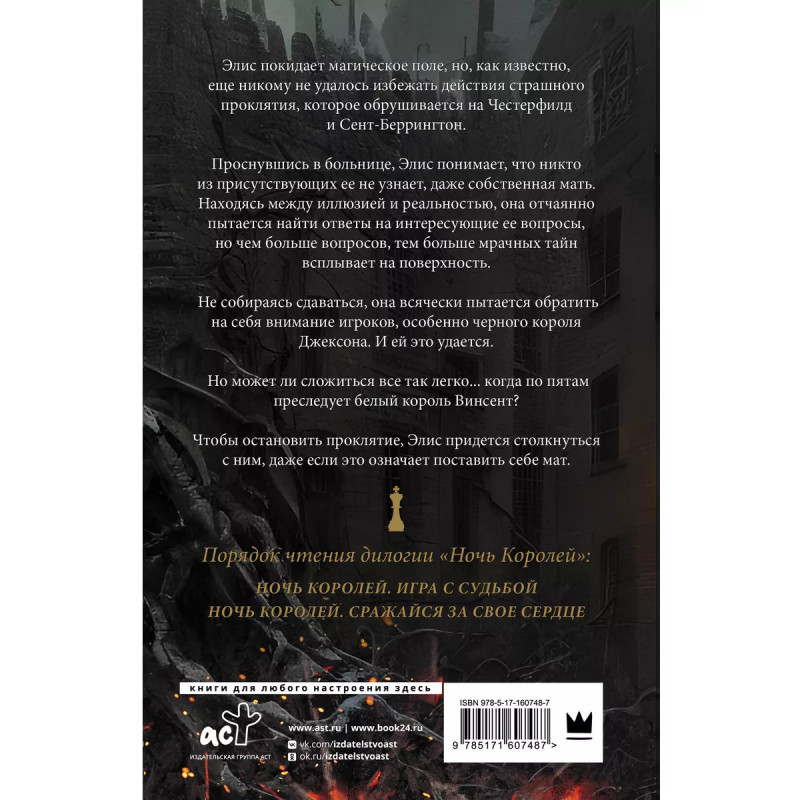 Ночь Королей. Сражайся за свое сердце. Элис покидает магическое поле, но, как известно, еще никому не удалось избежать действия страшного проклятия, которое обрушивается на Честерфилд и Сент-Беррингтон. Просыпаясь в больнице, Элис понимает, что никто из присутствующих ее не узнает, даже собственная мать. Находясь между иллюзией и реальностью, она отчаянно пытается найти ответы на интересующие ее вопросы, но чем больше вопросов, тем больше мрачных тайн всплывает на поверхность. Не собираясь сдаваться, она всячески пытается обратить на себя внимание игроков и особенно черного короля Джексона. И ей это удается. Но может ли сложиться все так легко когда по пятам преследует белый король Винсент? Чтобы остановить проклятие, Элис придется столкнуться с ним, даже если это означает поставить себе мат.