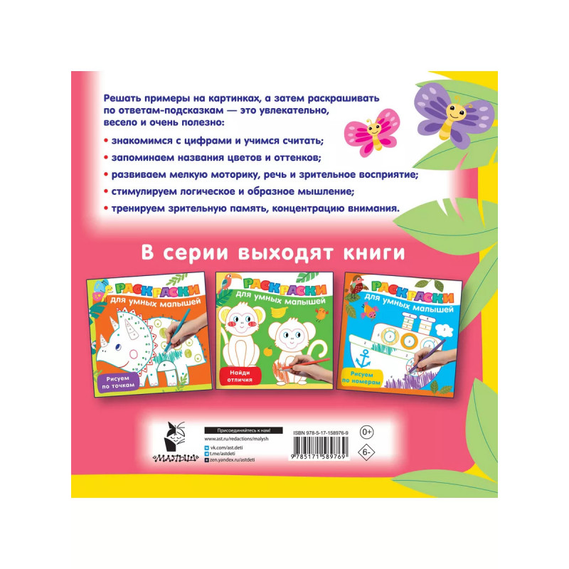 Сосчитай и раскрась. В. Г. Дмитриева - успешный автор детских книг и обучающих пособий. Ее книги - незаменимые помощники для родителей, желающих подготовить своих детей к школе. Серия "Раскраски для умных малышей" - полезная и незаменимая новинка для будущих первоклассников. Прекрасный выбор для подготовки руки к письму, освоения счёта в пределах первого десятка, развития мелкой моторики, графических навыков и интеллектуальной активности малыша. Благодаря ярким и весёлым рисункам каждое задание станет маленькой игрой. Решать примеры и раскрашивать картинки по ответам-номерам - это увлекательно, весело и очень полезно: " развиваем математические способности, осваиваем сложение и вычитание в пределах 1. " развиваем речь, мелкую моторику и зрительное восприятие; " знакомим с окружающим миром, формируем познавательный интерес; " стимулируем логическое и образное мышление; " формируем представление о предметах, их цвете, форме и размере; " тренируем зрительную память, концентрацию внимания; " воспитываем интерес к изобразительному иск