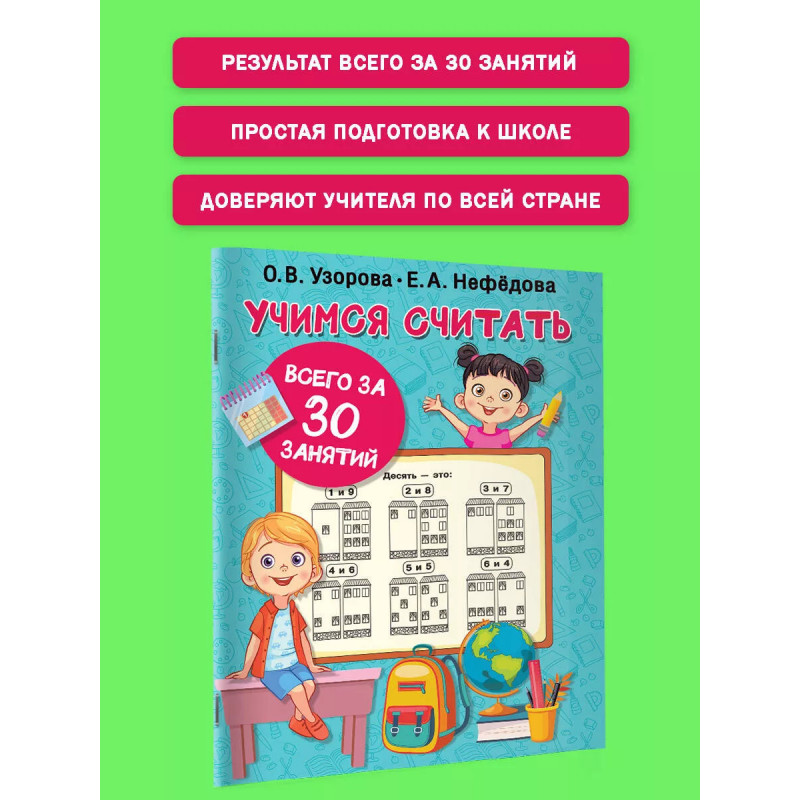 1. О. В. Узорова самый известный и востребованный автор учебных пособий. 2. Эффективная и быстрая методика подготовки детей к обучению в школе. 3. Счёт в пределах десяти важнейшая базовая тема для формирования начальных математических знаний. 4. Большое количество иллюстраций.