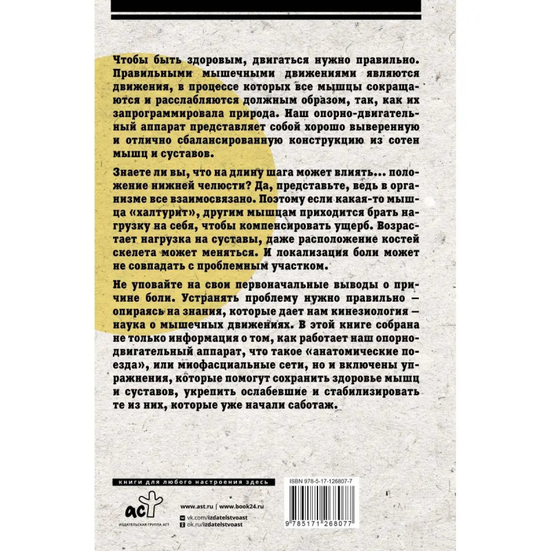 5 причин купить: наиболее полное научно-популярное руководство по прикладной кинезиологии на русском языке; включены базовые основы анатомии и биомеханики человека; более 25 оригинальных упражнений; научитесь распознавать сигналы вашего организма в виде боли, чувства онемения или скованности; узнаете, какие причины могут приводить к нетрудоспособности ваших мышц.
