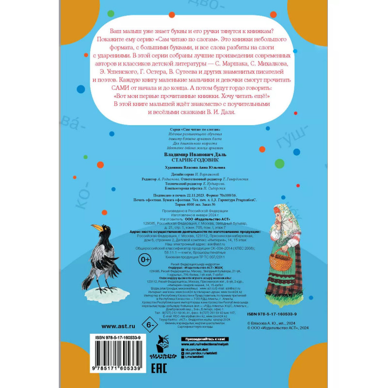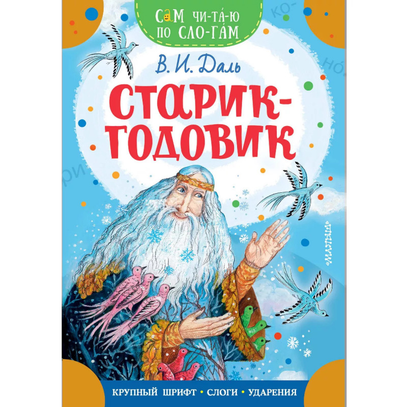 Старик-годовик. Крупный шрифт, разбивка на слоги, ударения, запоминающиеся цветные иллюстрации - в книгах серии "Сам читаю по слогам" есть всё необходимое для формирования у ребенка прочного навыка чтения и стимулирования устойчивого интереса к книге. А еще это прекрасная возможность познакомиться с лучшими произведениями любимых детских авторов, многие из которых стали неотъемлемой частью отечественной культуры. Знать их - признак образованного, культурного человека. Идеальное сочетание "цена-качество! Книги не будут обременительны для семейного бюджета и принесут массу пользы, создадут прекрасное настроение. Уютные волшебные сказки В. Даля обязательно понравятся вашему малышу и отлично подойдут для первого чтения.