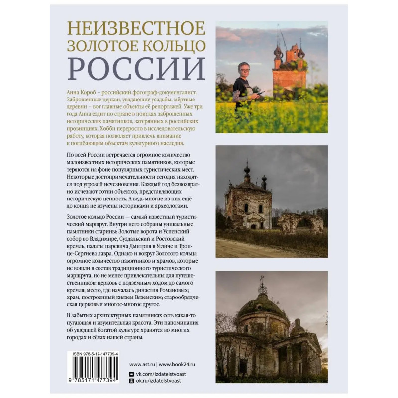 Первым историческим памятником, поразившим воображение автора, стала усадьба Астафьева. С тех пор фотограф-документалист Анна Короб сфотографировала уже более 15 заброшенных памятников русской архитектуры, и, по ее словам, осталось ещё столько же. Книга будет интересна всем ценителям отечественной истории и культуры, а также туристам, ищущим необычные маршруты для своих путешествий по России. Архитектурное наследие России постепенно исчезает: на наших глазах рушатся усадьбы, сгорают деревянные дома, превращаются в руины древние церкви. Спасти это все в одиночку невозможно, но под силу привлечь внимание к проблеме. Фотограф Анна Короб занимается именно этим. AD Magazine Russia