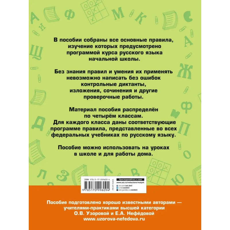 В пособии собраны все правила, необходимые для автоматического грамотного письма, представленные во всех федеральных учебниках по русскому языку 1-4 классов.. Без знания этой теории невозможно написать без ошибок различные проверочные работы. Пособие поможет учителям и родителям проверить качество знаний детей, а ученикам подготовиться к контрольным работам и мини-ЕГЭ.