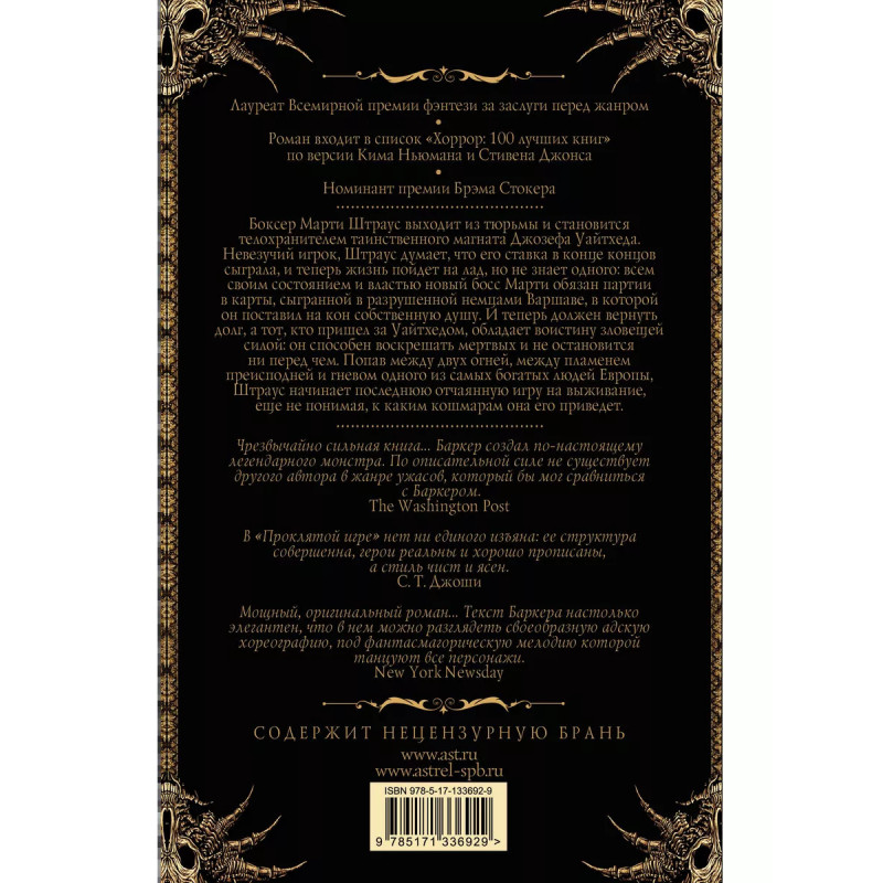 Проклятая игра. Боксер Марти Штраус выходит из тюрьмы и становится тел.оxранителем таинственного магната Джозефа Уайтхеда. Невезучий игрок, Штраус думает, что его ставка в конце концов сыграла и теперь жизнь пойдет на лад, но не знает одного: всем своим состоянием и властью новый босс Марти обязан партии в карты, сыгранной в разрушенной немцами Варшаве, в которой он поставил на кон собственную душу. И теперь должен вернуть долг, а тот, кто пришел за Уайтхедом, обладает воистину зловещей силой: он способен воскрешать мертвых и не остановится ни перед чем. Попав между двух огней, между пламенем преисподней и гневом одного из самых богатых людей Европы, Штраус начинает последнюю отчаянную игру на выживание, еще не понимая, к каким кошмарам она его приведет.
