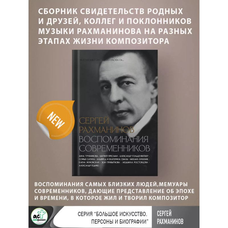 Сергей Рахманинов. Воспоминания современников. Всю музыку он слышал насквозь.... Книга представляет собой сборник свидетельств родных и друзей, коллег и поклонников музыки Рахманинова на разных этапах жизни композитора. В ней есть и воспоминания самых близких к Сергею Васильевичу и его семье людей, и мемуары современников, дающие представление об эпохе и времени, в которое жил и творил композитор. Задумывая этот проект, мы видели его второй частью "дилогии", в которую вошли бы книга Оскара фон Риземана "Сергей Рахманинов. Воспоминания" и сборник мемуаров многих героев этих воспоминаний. Мы собрали эти воспоминания вместе в последовательности, близкой к хронологической, оставив за рамками нашей книги исследовательские и музыкально-аналитические статьи и сохранив беллетристическую, новеллистическую интонацию, как и в книге Риземана, настолько проникшегося жизнью и судьбой Сергея Рахманинова, что при чтении порой исчезает граница между речью композитора и автора.