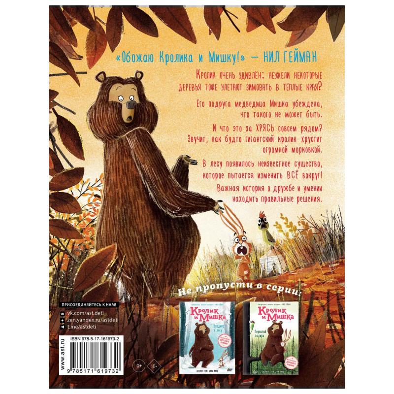 Кролик и Мишка. Ночной кошмар. Кролик ужасно взволнован: похоже, некоторые деревья начали улетать на зиму из леса в тёплые края. Его подруга, медведица Мишка, уверена, что деревья не умеют летать. Значит, дело в чём-то другом. И что это за ХРЯСЬ совсем рядом? Звучит, как будто гигантский кролик хрустит гигантской морковкой. В лесу появилось новое неизвестное существо, которое пытается изменить ВСЁ вокруг! Серия книг про Кролика и Мишку была переведена на 12 языков и попала в шортлисты премий Великобритании и Ирландии. Писатель Джулиан Гоф пишет новеллы, радиоспектакли для Би-би-си и успешные театральные пьесы. Он победитель премии The Roald Dahl Funny Prize. Иллюстратор Джим Филд является обладателем таких престижных премий, как The Roald Dahl Funny Prize, Sainsburys Picture Book of the Year, Oscars Book Prize и многих других. "Кролик и Мишка. Ночной кошмар" - это смешная история о дружбе и принятии изменений вокруг и в себе.