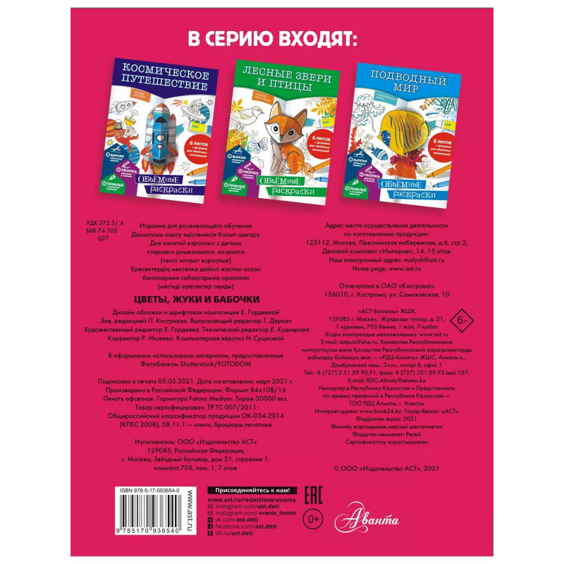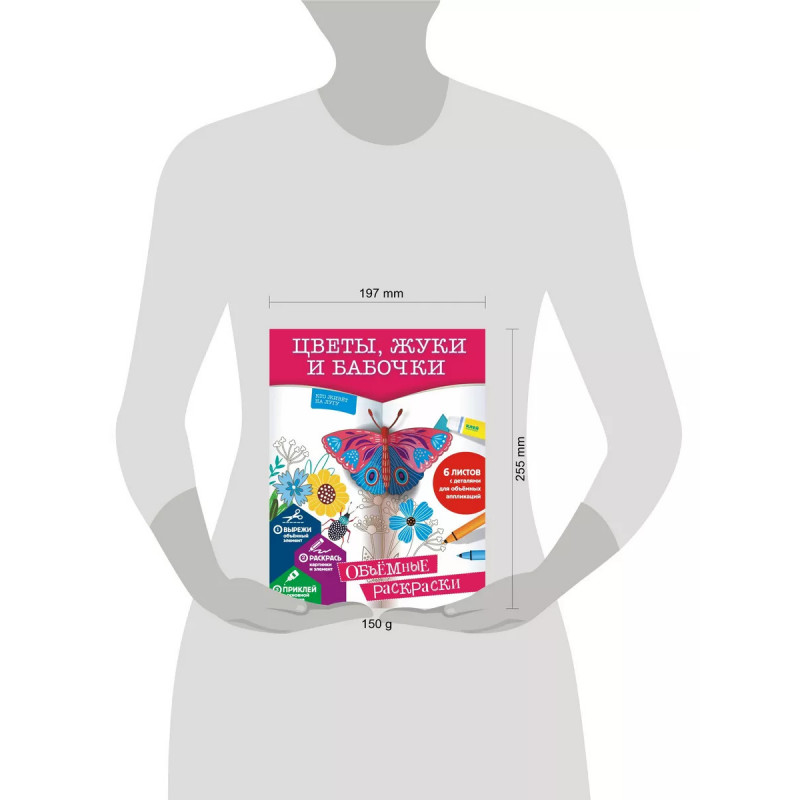 Цветы, жуки и бабочки. Новая серия "Объемные раскраскиФП" Эти книги можно не только раскрашивать, но и создавать на их страницах настоящие объемные аппликации. Для этого надо вырезать детали с центральных страниц книги и наклеить их на развороты в нужных местах.
