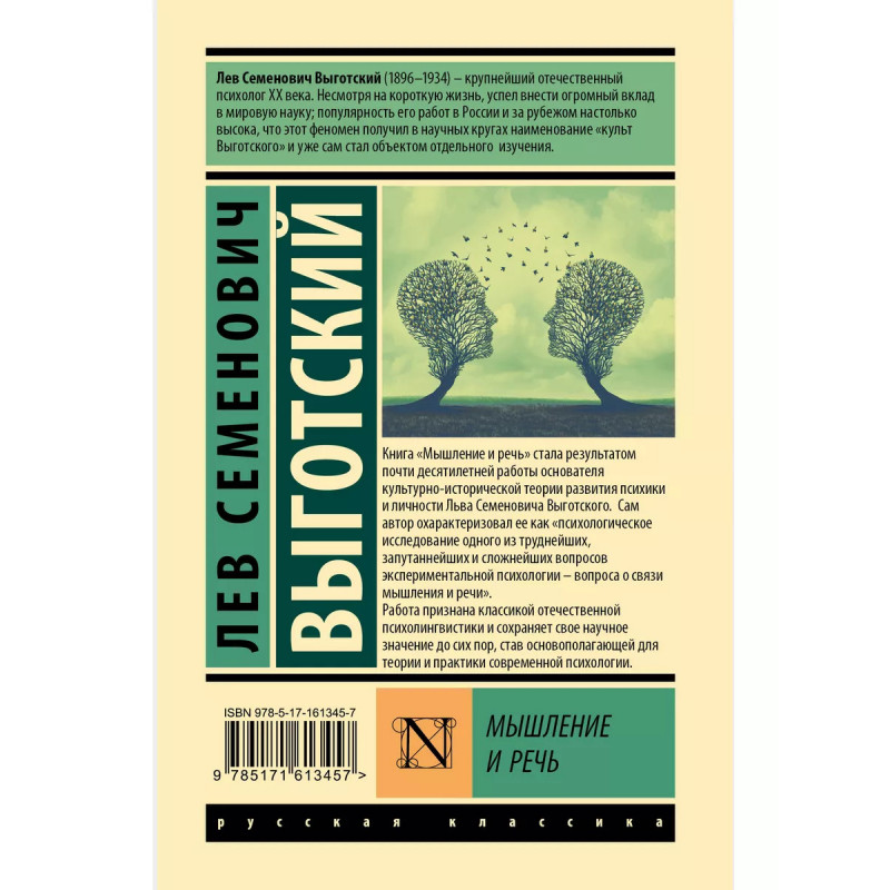 Мышление и речь. Книга "Мышление и речь" стала результатом почти десятилетней работы основателя культурно-исторической теории развития психики и личности Льва Семеновича Выготского. Сам автор охарактеризовал ее как "психологическое исследование одного из труднейших, запутаннейших и сложнейших вопросов экспериментальной психологии - вопроса о связи мышления и речи". Работа признана классикой отечественной психолингвистики и сохраняет свое научное значение до сих пор, став основополагающей для теории и практики современной психологии.