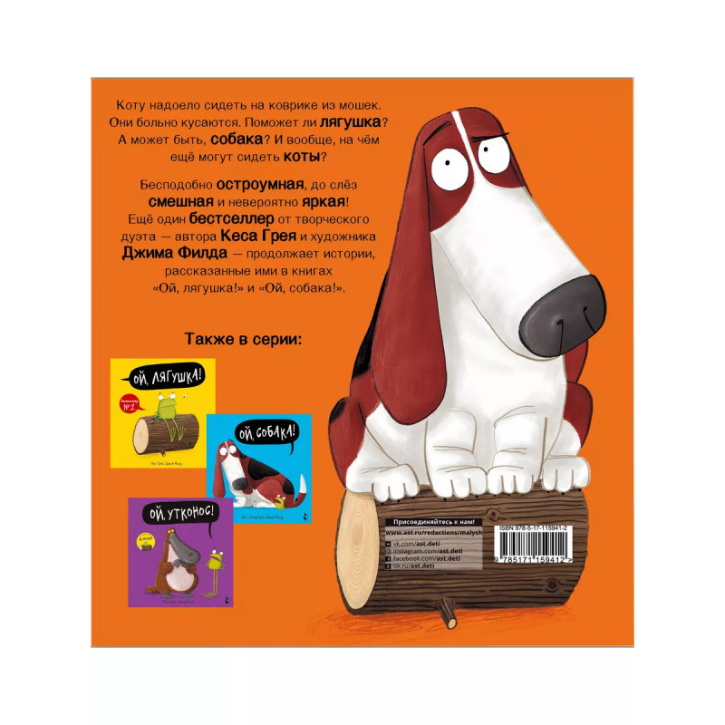 Ой, кот!. Коту надоело сидеть на коврике из мошек. Они больно кусаются. Поможет ли Лягушка? А может быть, Собака? И вообще, на чём ещё могут сидеть коты? Бесподобно остроумная, до слёз смешная и невероятно яркая! Ещё один бестселлер от творческого дуэта - автора Кеса Грея и художника Джима Филда - продолжает истории, рассказанные ими в книгах "Ой, Лягушка!" и "Ой, Собака!".