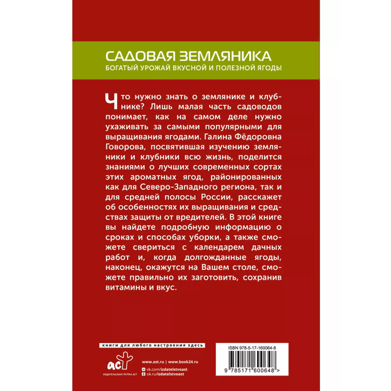Садовая земляника. Богатый урожай вкусной и полезной ягоды. Что нужно знать о землянике и клубнике? Лишь малая часть садоводов понимает, как на самом деле нужно ухаживать за этими самыми популярными для выращивания ягодами. Галина Фёдоровна Говорова, посвятившая изучению земляники и клубники всю жизнь, поделится знаниями о лучших современных сортах этих ароматных ягод, районированных как для Северо-Западного региона, так и для средней полосы России, расскажет об особенностях их выращивания и средствах защиты от вредителей. В этой книге вы найдете подробную информацию о сроках и способах уборки, а также сможете свериться с календарем дачных работ и, когда долгожданные ягоды, наконец, окажутся на вашем столе, сможете правильно их заготовить, сохранив витамины и вкус.
