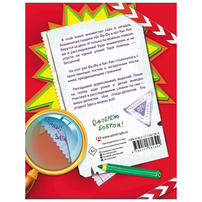 Фу-Фу и Кис-Кис. Книга игр и расследований. Загадочные рукописи. В этой книге множество тайн и загадок. Знаменитые сыщики пёс Фу-Фу и кот Кис-Кис берутся за дело. И только ты можешь помочь им в расследовании! Будь внимателен и не упусти ни одной улики! Твоя помощь - бесценна! На этот раз Фу-Фу и Кис-Кис столкнулись с загадочным посланием, предвещающим страшное!.. и таинственным гостем. Разгадывай, дорисовывай, вырезай. Пиши на полях, ищи улики и делай выводы. Участвуй в расследовании, словно ты сам - зверь-детектив. Или птица-детектив. Кто угодно! Здесь можно всё!