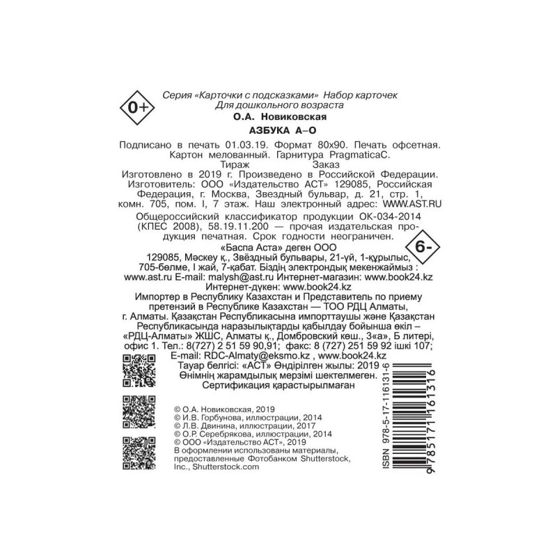 Азбука А-О. О чем эта книга Набор карточек с буквами А-О русского алфавита. Кому эта книга будет интересна Любознательным малышам и заботливым родителям! Каковы особенности этой книги " Карточки с весёлыми и яркими картинками-подсказками познакомят ребёнка с буквами А-О русского алфавита. " Игры с карточками расширяют словарный запас, улучшают память и внимание, тренируют пальчики, развивают наблюдательность и мелкую моторику. " Комплект карточек универсален - его можно использовать как на занятиях дома, так и в детском саду. Учиться по карточкам полезно, весело, интересно!
