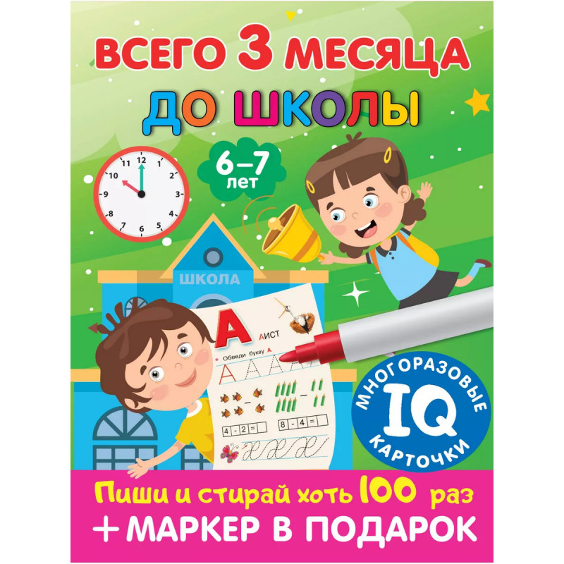 Всего 3 месяца до школы. Для детей 6-7 лет. Скоро в школу? Кажется, что подготовка к 1 классу - тяжёлый труд? Поможет набор многоразовых IQ карточек "Всего 3 месяца до школы. Для детей 6-7 лет"! Ребёнок узнает много нового об окружающем мире, поиграет в занимательные игры, выполнит задания, развивающие мышление, внимание и память, подготовит руку к письму, научится рисовать забавных животных. К карточкам прилагается маркер на водной основе - любую надпись легко стереть. Подготовка к школе становится весёлой игрой!