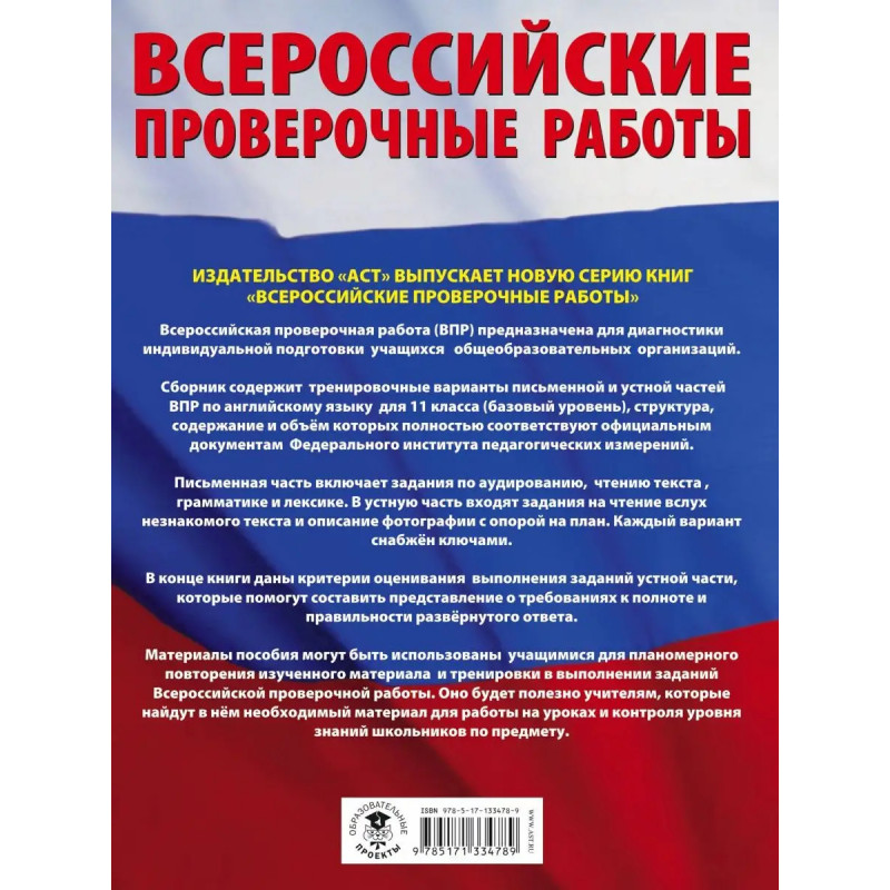 Пособие предназначено для подготовки выпускников средней школы к Всероссийской проверочной работе (ВПР) по английскому языку. Сборник содержит 1 тренировочных вариантов письменной и устной части ВПР. Письменная часть включает задания по аудированию, чтению текста , грамматике и лексике. Все задания снабжены ключами. В устную часть входят задания на чтение вслух незнакомого текста и описание фотографии с опорой на план. В конце книги даны критерии оценивания выполнения этих заданий, которые помогут составить представление о требованиях к полноте и правильности развёрнутого ответа. Материалы пособия могут быть использованы учащимися для планомерного повторения изученного материала и тренировки в выполнении заданий Всероссийской проверочной работы. Оно будет полезно учителям, которые найдут в нём необходимый материал для работы на уроках и контроля уровня знаний школьников по предмету.