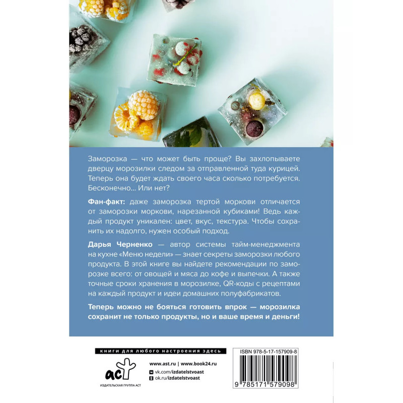 Заморозка. Готовим впрок. Заморозка - что может быть проще? Вы захлопываете дверцу морозилки следом за отправленной туда курицей. Теперь она будет ждать своего часа сколько потребуется. Бесконечно Или нет? Фан-факт: даже заморозка тертой моркови отличается от заморозки моркови, нарезанной кубиками! Ведь каждый продукт уникален: цвет, вкус, текстура. Чтобы сохранить их надолго, нужен особый подход. Дарья Черненко - автор системы тайм-менеджмента на кухне "Меню недели" - знает секреты заморозки любого продукта. В этой книге вы найдете рекомендации по заморозке всего: от овощей и мяса до кофе и выпечки. А также точные сроки хранения в морозилке, QR-коды с рецептами на каждый продукт и идеи домашних полуфабрикатов. Теперь можно не бояться готовить впрок - морозилка сохранит не только продукты, но и ваше время и деньги!