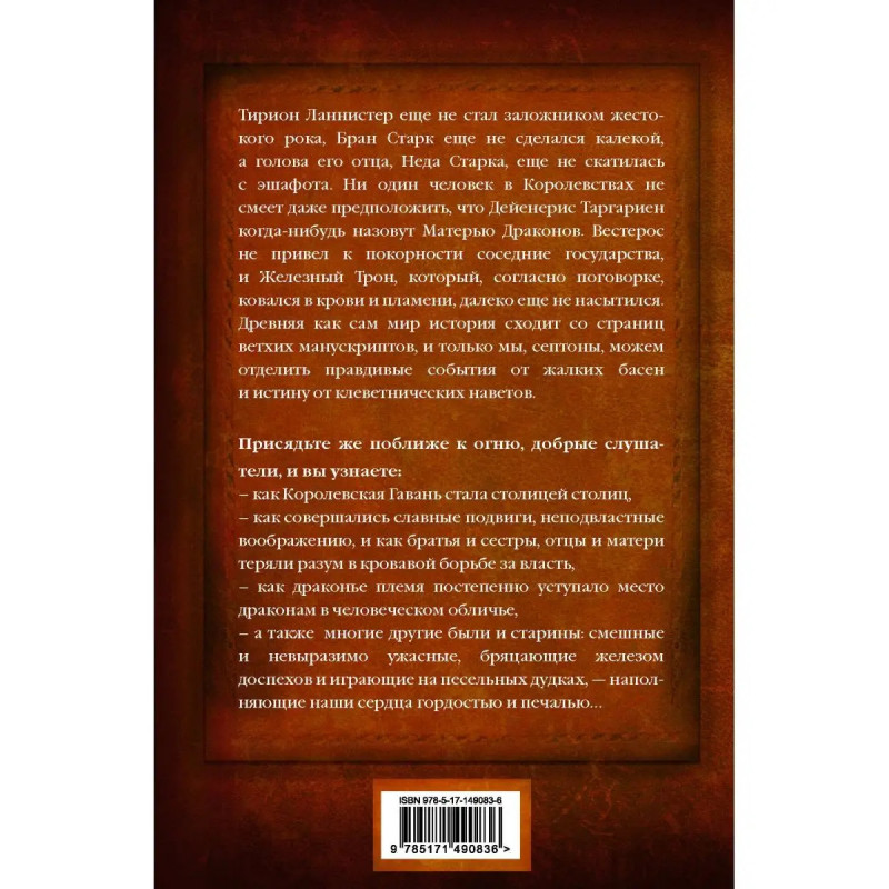Тирион Ланнистер еще не стал заложником жестокого рока, Бран Старк еще не сделался калекой, а голова его отца Неда Старка еще не скатилась с эшафота. Ни один человек в Королевствах не смеет даже предположить, что Дейенерис Таргариен когда-нибудь назовут Матерью Драконов. Вестерос не привел к покорности соседние государства, и Железный Трон, который, согласно поговорке, ковался в крови и пламени, далеко еще не насытился. Древняя, как сам мир, история сходит со страниц ветхих манускриптов, и только мы, септоны, можем отделить правдивые события от жалких басен, и истину от клеветнических наветов. Присядьте же поближе к огню, добрые слушатели, и вы узнаете: как Королевская Гавань стала столицей столиц, как свершались славные подвиги, неподвластные воображению, и как братья и сестры, отцы и матери теряли разум в кровавой борьбе за власть, как драконье племя постепенно уступало место драконам в человеческом обличье, а также и многие другие были и старины смешные и невыразимо ужасные, бряцающие железом д