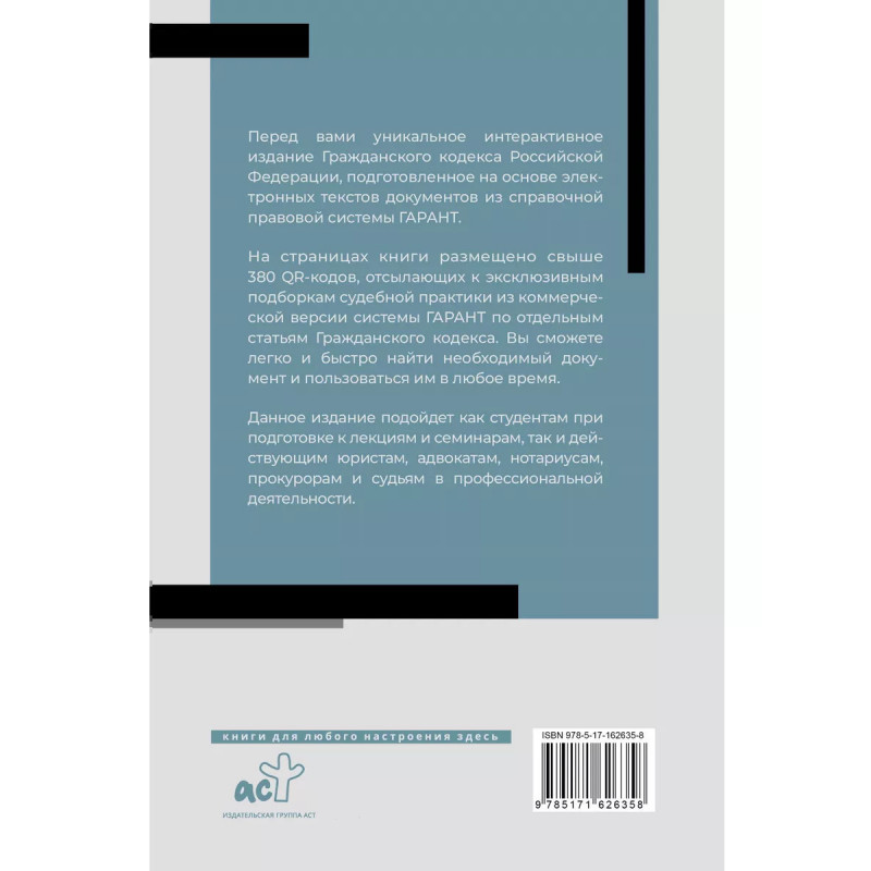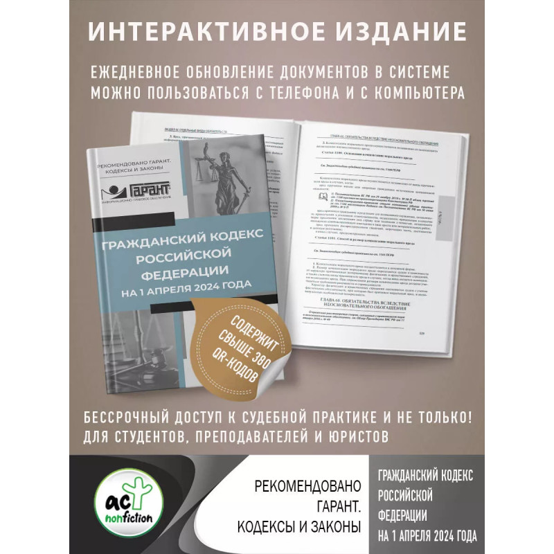 Перед вами уникальное интерактивное издание Гражданского кодекса Российской Федерации по состоянию на 1 апреля 2024 года, подготовленное на основе электронных текстов документов из справочной правовой системы "ГАРАНТ". На страницах книги размещено свыше 380 QR-кодов, перейдя по которым вы получите постоянный доступ: к эксклюзивным материалам системы ГАРАНТ в формате Энциклопедий судебной практики; к полному содержанию Постановлений Пленумов Верховного Суда и Высшего Арбитражного Суда РФ, связанных с применением отдельных положений Гражданского кодекса; к обзорам правоприменительной практики судов общей юрисдикции и арбитражных судов РФ; к самой свежей редакции ГК, которая поможет вам быть в курсе всех последних изменений! Вам больше не придется тратить время на поиск судебной практики, поскольку в данной книге уже собраны все важнейшие судебные акты, которые доступны в приложении "ГАРАНТ".