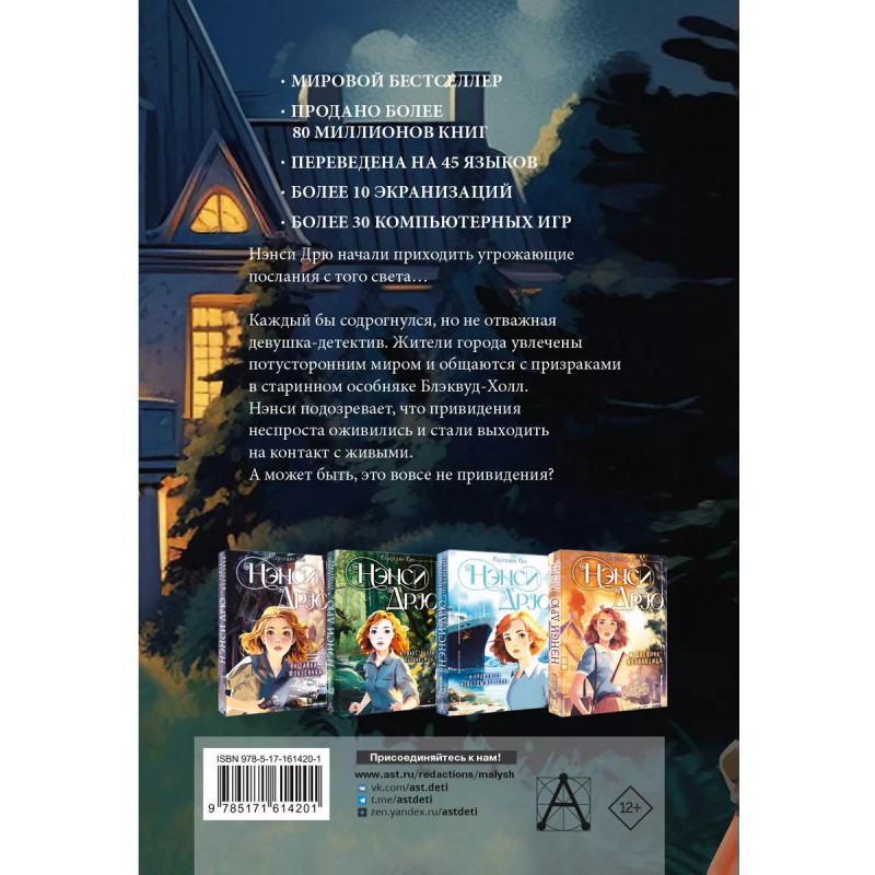 НЭНСИ ДРЮ и привидение Блэквуд-Холла. Нэнси Дрю начали приходить угрожающие послания с того света Каждый бы содрогнулся, но не отважная девушка-детектив. Жители города увлечены потусторонним миром и общаются с призраками в старинном особняке Блэквуд-Холл. Нэнси подозревает, что привидения неспроста оживились и стали выходить на контакт с живыми. А может быть, это вовсе не привидения?