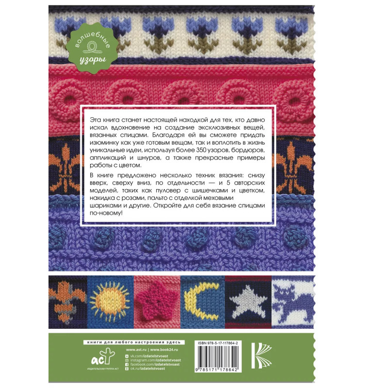 Эксклюзивные узоры для вязания спицами. Уникальные бордюры, шнуры, аппликации, примеры работы с цветом, несколько способов вязания: снизу вверх, сверху вниз, по отдельности, а также 5 авторских моделей. Теперь вы с легкостю сможете придать изюминку как уже готовым вещам, так и воплотить в жизнь свои уникальные идеи.