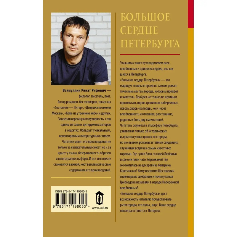 Долгожданная новинка от автора бестселлеров Где валяются поцелуи. Париж, Состояние Питер. Книга станет отличным спутником в прогулках по городу для туристов, а жителям Северной столицы откроет новый взгляд на привычные достопримечательности. Это самая неожиданная, лиричная и нежная книга Рината Валиуллина. Роман-откровение, роман-путеводитель и роман-признание в любви к великолепному городу. Проза Рината Валиуллина уникальна и притягательна, она состоит из ярких образов, вкусных диалогов и поэтичных деталей. Лучший способ изучить город это стать его частью, погрузиться в атмосферу улиц и в мысли людей. Петербург знакомый всем город, но сколько историй хранит его гранитная брусчатка, по которой ходили как легендарные писатели, так и простой народ! Роман Большое сердце Петербурга оживит эти истории и сквозь них покажет неизвестную красоту легендарных мест. Если глаза видят, то сердце чувствует на Петербург нужно научиться смотреть правильно. Эмоциональный отклик посл