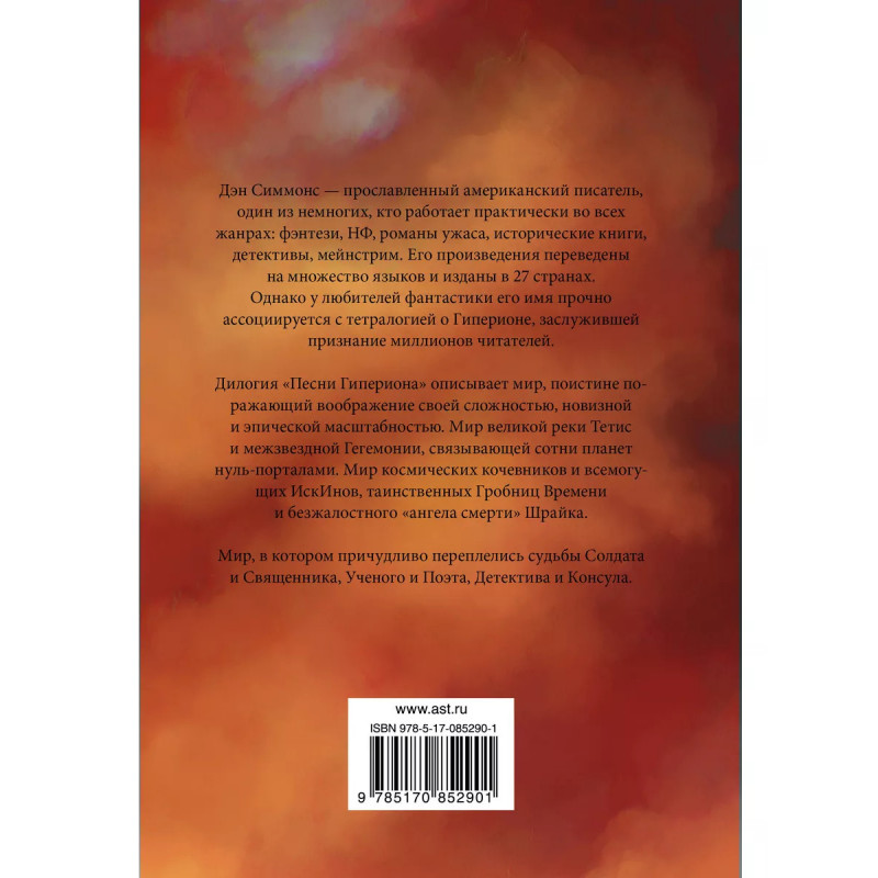 Гиперион. Падение Гипериона. Дэн Симмонс - прославленный американский писатель, один из немногих, кто работает практически во всех жанрах - фэнтези, НФ, романов ужаса, исторических книг, детективов, мейнстрима. Его произведения переведены на множество языков и изданы в 27 странах. Однако у любителей фантастики его имя прочно ассоциируется с тетралогией о Гиперионе, заслужившей признание миллионов читателей. Дилогия "Песни Гипериона" описывает мир, поистине поражающий воображение своей сложностью, новизной и эпической масштабностью. Мир великой реки Тетис - и межзвездной Гегемонии, связывающей сотни планет нуль-порталами. Мир космических кочевников и всемогущих ИскИнов, таинственных Гробниц Времени и безжалостного "ангела смерти" Шрайка. Мир, в котором причудливо переплелись судьбы Солдата и Священника, Ученого и Поэта, Детектива и Консула.