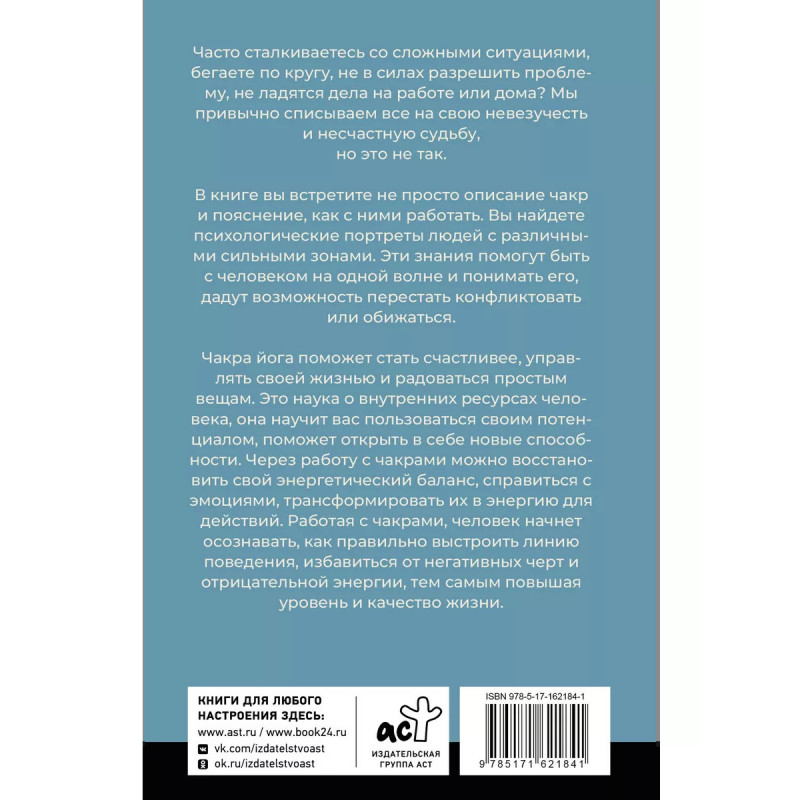 Чакры. Активируем внутренние ресурсы. Часто сталкиваетесь со сложными ситуациями, бегаете по кругу, не в силах разрешить проблему, не ладятся дела на работе или дома? Мы привычно списываем все на свою невезучесть и несчастную судьбу, но это не так. В книге вы встретите не просто описание чакр и пояснение, как с ними работать. Вы найдете психологические портреты людей с различными сильными зонами. Эти знания помогут быть с человеком на одной волне и понимать его, дадут возможность перестать конфликтовать или обижаться. Чакра йога поможет стать счастливее, управлять своей жизнью и радоваться простым вещам. Это наука о внутренних ресурсах человека, она научит вас пользоваться своим потенциалом, поможет открыть в себе новые способности. Через работу с чакрами можно восстановить свой энергетический баланс, справиться с эмоциями, трансформировать их в энергию для действий. Работая с чакрами, человек начнет осознавать, как правильно выстроить линию поведения, избавиться от негативных черт и отрицательной энергии, тем самым повышая уровень и качество жиз