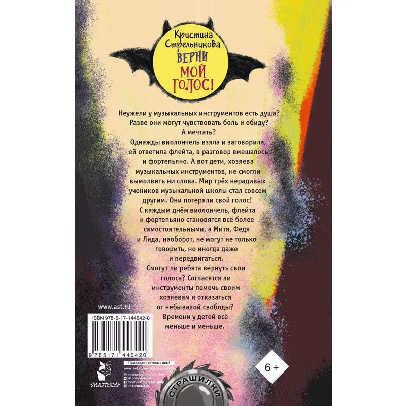 Верни мой голос!. Кристина Стрельникова - детский писатель, лауреат Всероссийской литературной премии для детских писателей и поэтов им. С. Маршака за рассказы для детей (2017), лауреат международной детской литературной премии им. Владислава Крапивина за повесть для детей "Тётя Шляпа. Охота на Тамаранду" (2016). В новой повести Кристины Стрельниковой "Верни мой голос!" происходят страшные события. Митя, Федя и Лида теряют способность говорить, вместо детей начинают разговаривать их музыкальные инструменты! С каждым днём виолончель, флейта и фортепьяно приобретают всё большую самостоятельность, а дети порой не могут не только произнести слова, но и не в состоянии даже пошевелить рукой. Самое страшное, что музыкальным инструментам нравится вольная жизнь. Захотят ли инструменты отдать голоса своим нерадивым хозяевам? Для среднего школьного возраста.