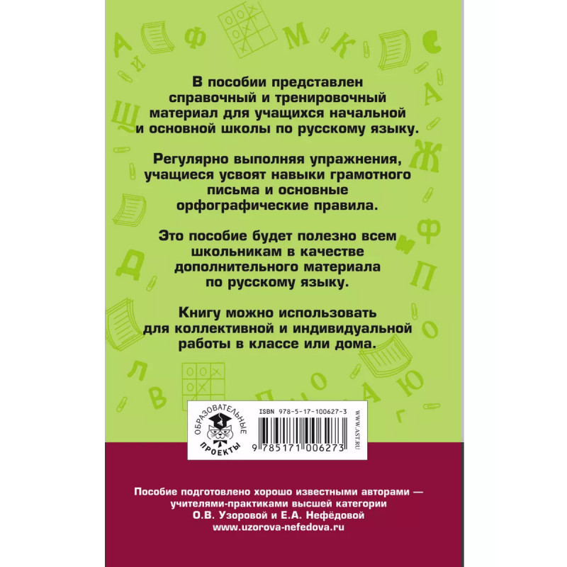 В пособии известных педагогов-практиков, авторов самых издаваемых учебников и учебных пособий в России О.В. Узоровой и Е.А. Нефёдовой представлен материал по всем темам курса русского языка для начальной и основной школы. В одной книге собраны все правила и различные упражнения к ним, позволяющие ученику научиться правильно их применять и приобрести навык грамотного письма. Пособие можно использовать на уроке в школе и для самостоятельных занятий дома.