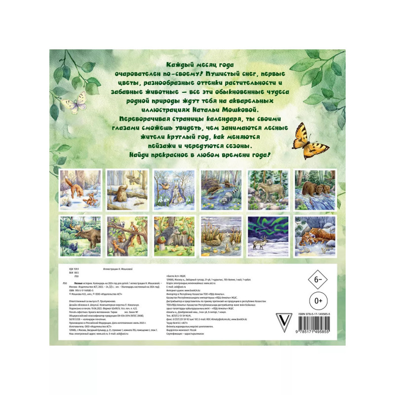 Лесные истории. Календарь на 2024 год для детей. Каждый месяц года очарователен по-своему! Пушистый снег, первые цветы, разнообразные оттенки растительности и забавные животные - все эти обыкновенные чудеса родной природы ждут тебя в акварельных иллюстрациях художницы Натальи Мошковой. Переворачивая страницы календаря, ты своими глазами сможешь увидеть, чем занимаются лесные жители круглый год, как меняются пейзажи и чередуются сезоны. Найди прекрасное в любом времени года!