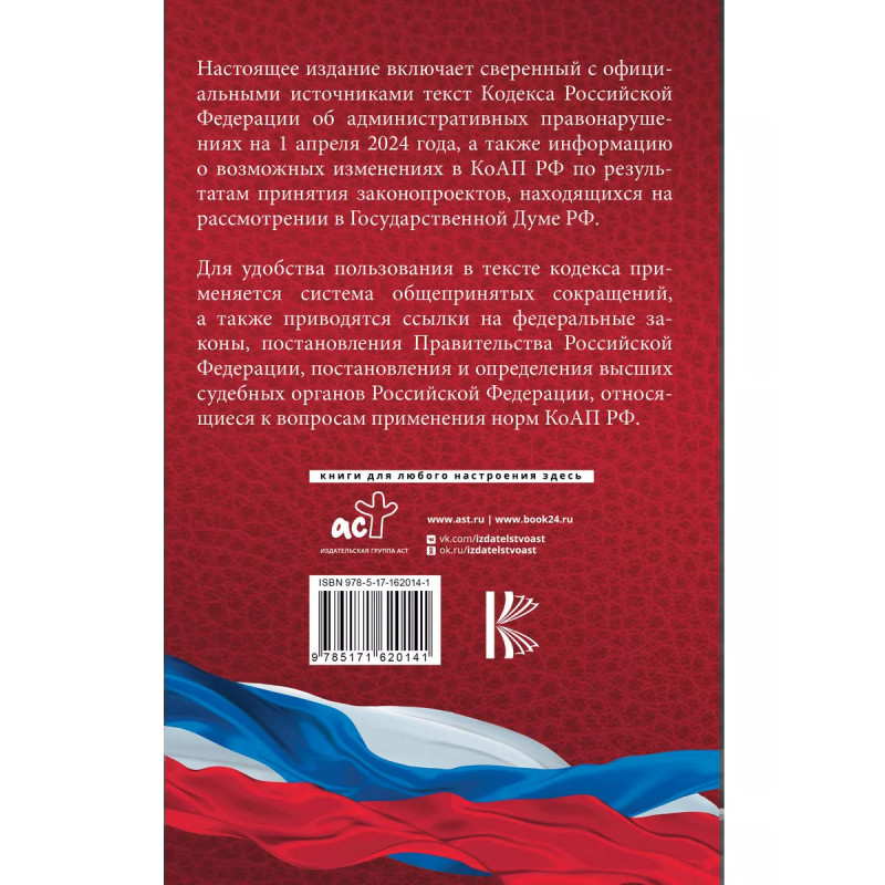 Данное издание кодекса Российской Федерации об административных правонарушениях сверено с официальным источником и приводится по состоянию на 1 апреля 2024 года. Кодекс учитывает все изменения, опубликованные в официальных источниках на момент подписания издания в печать. В издании представлена информация о возможных изменениях в КоАП РФ по результатам принятия законопроектов, находящихся на рассмотрении в Государственной Думе РФ. Для удобства пользования в тексте кодекса применяется система общепринятых сокращений, а также приводятся ссылки на федеральные законы, постановления Правительства Российской Федерации, постановления и определения высших судебных органов Российской Федерации, относящиеся к вопросам применения норм КоАП РФ.