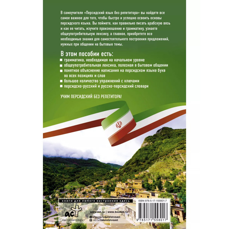 Персидский язык без репетитора. Самоучитель персидского языка. Вы хотите выучить персидский, но не знаете, как к нему подступиться? Тогда это пособие - для вас. Ваше погружение в персидский язык будет комфортным и приятным благодаря последовательному и логичному изложению только необходимой для начинающих теории, посильной практике, актуальной для повседневного общения лексике, а главное, дружелюбной подаче материала, которая не оставит вас равнодушным. Самоучитель состоит из 18 уроков, за которые вы овладеете чтением и письмом на персидском языке, познакомитесь с временами, основными видами глаголов, особенностями местоимений, существительных, прилагательных и числительных, запомните некоторые предлоги и союзы, узнаете о такой важной конструкции, как изафет, и научитесь строить простые предложения, полезные в обиходе. В многочисленных упражнениях вы закрепите полученные знания и сможете проверить себя по ответам в конце издания. Также для вашего удобства в конце самоучителя представлены персидско-русский и русско-персидский словари с транскрипциями, которые записаны лат