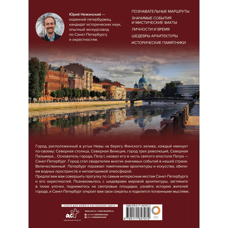 АВТОР книги: Юрий Нежинский - коренной петербуржец, кандидат исторических наук, опытный экскурсовод, по Санкт-Петербургу и окрестностям. Данная книга - уникальный путеводитель по Санкт-Петербургу, содержащий интересные материалы и качественные фотографии. Автор проводит экскурсии по городу, ставшему свидетелем многих значимых событий в нашей стране. Знакомит читателя с шедеврами мировой архитектуры, их заказчиками и великими архитекторами. Отличный подарочный альбом для тех, кто любит гулять по проспектам и тихим улочкам Санкт-Петербурга - это своеобразный стимул к посещению новых интересных мест. А также замечательный подарок для тех, кто не имеет возможности для поездки, поскольку информация и фото, приведенные в книге, помогают путешествовать по Северной Пальмире, не выходя из дома.