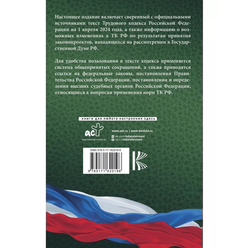 Данное издание Трудового кодекса Российской Федерации сверено с официальным источником и приводится по состоянию на 1 апреля 2024 года. Кодекс учитывает все изменения, опубликованные в официальных источниках на момент подписания издания в печать. В издании представлена информация о возможных изменениях в ТК РФ по результатам принятия законопроектов, находящихся на рассмотрении в Государственной Думе РФ. Для удобства пользования в тексте кодекса применяется система общепринятых сокращений, а также приводятся ссылки на федеральные законы, постановления Правительства Российской Федерации, постановления и определения высших судебных органов Российской Федерации, относящиеся к вопросам применения норм ТК РФ.