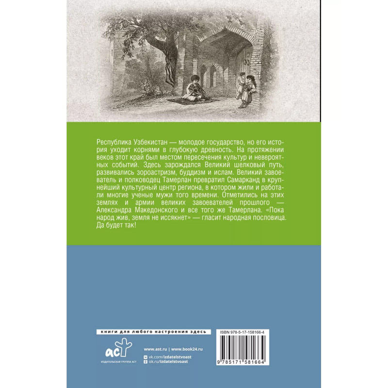 Узбекистан. Полная история. Республика Узбекистан - молодое государство, но его история уходит корнями в глубокую древность. На протяжении веков этот край был местом пересечения культур и невероятных событий. Здесь проходил Великий шелковый путь, развивались зороастризм, буддизм и ислам. Тимур превратил Самарканд в крупнейший культурный центр региона, где жили, работали и трудились многие ученые мужи того времени. Отметились на этих землях и армии великих завоевателей прошлого - Александр Македонский и Тамерлан. "Пока народ жив, земля не иссякнет" - гласит народная пословица. Да будет так!.