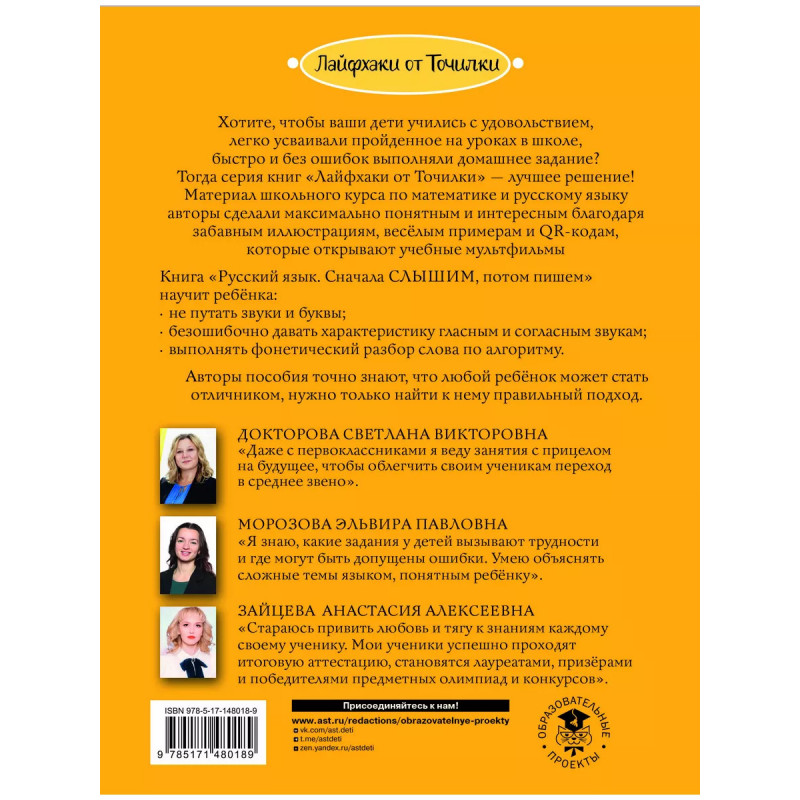 Хотите, чтобы ваши дети учились с удовольствием, легко усваивали пройденное на уроках в школе, быстро и без ошибок выполняли домашнее задание? Тогда серия книг "Лайфхаки от Точилки" лучшее решение! Материал школьного курса по математике и русскому языку авторы сделали максимально понятным и интересным благодаря забавным иллюстрациям, весёлым примерам и QR-кодам, которые открывают учебные мультфильмы. Книга "Русский язык. Сначала СЛЫШИМ, потом пишем" научит ребёнка: . не путать звуки и буквы; . безошибочно давать характеристику гласным и согласным звукам; . выполнять фонетический разбор слова по алгоритму. Авторы пособия точно знают, что любой ребёнок может стать отличником, нужно только найти к нему правильный подход.