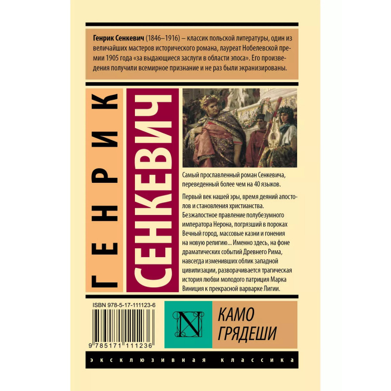 Камо грядеши. Самый прославленный роман Сенкевича, переведенный более чем на 4 языков. Первый век нашей эры, время деяний апостолов и становления христианства. Безжалостное правление полубезумного императора Нерона, погрязший в пороках Вечный город, массовые казни и гонения на новую религию Именно здесь, на фоне драматических событий Древнего Рима, навсегда изменивших облик западной цивилизации, разворачивается трагическая история любви молодого патриция Марка Виниция к прекрасной варварке Лигии.