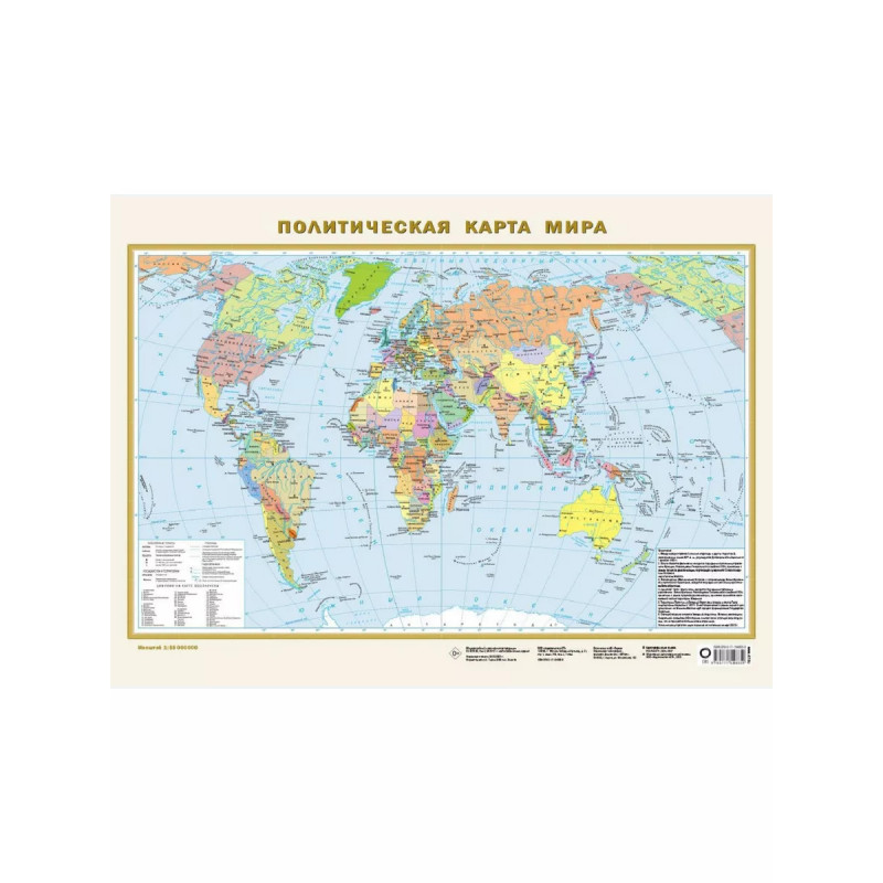 Политическая карта мира. Федеративное устройство России А2 (в новых границах). Двухсторонняя покрытая полимерной плёнкой карта имеет размеры 575х42 мм. На одной её стороне - обновлённая Политическая карта мира в масштабе 1:58 (в 1 см 58 км), на другой - обновлённая карта "Федеративное устройство России" в масштабе 1:15 (в 1 см 15 км). На Политической карте мира цветом и подписями показаны все независимые государства с их столицами, а также владения и территории с особым статусом. Населённые пункты на карте даны в трёх градациях численности: более 1 млн жителей, от 1 тыс. до 1 млн, менее 1 тыс. жителей. На карте России представлены все 89 субъектов Федерации (с Донецкой и Луганской народными республиками, Запорожской и Херсонской областями, Республикой Крым и Севастополем), с их столицами и центрами. Субъекты РФ сгруппированы по 8 федеральным округам. Показаны магистральные пути железнодорожного и автомобильного сообщения. Рекомендовано для широкого круга пользователей.
