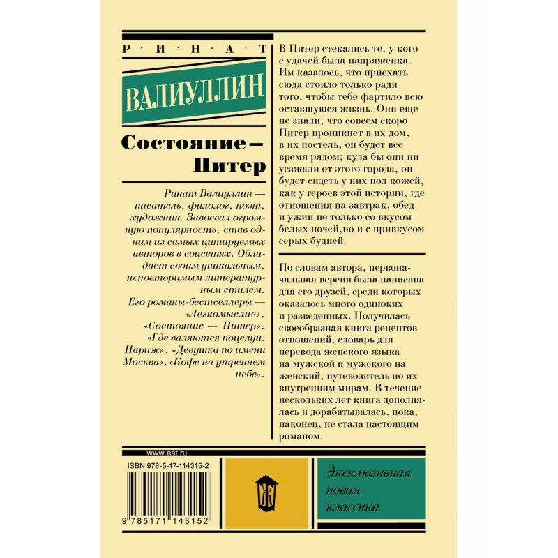 Состояние - Питер. Главный герой новой книги мастера современной прозы Рината Валиуллина - Санкт-Петербург. Город, дробясь на ровные квадраты прямыми каналами и проспектами, дрожжит, отражаясь, в темной воде, и водит, закручивает в спирали маршруты влюбленных в него и друг в друга людей. Едва оказавшись на улицах Питера, герои романа полностью погружаются в состояние, в котором уже не властны над своими поступками и желаниями. "Состояние - Питер" - это история любви, в которой муж пытается понять, чем отличается любимая девушка от жены, которой она стала, мечтает о жареной корюшке и чебуреках, и упражняется в иронии, беседуя с парой туристов, остановившихся в его доме. Юная жена отчаянно нуждается в любви и ускользая от того, кто стал с ней холоден, словно вода в Неве, мучительно ищет выход из счастливого тупика, каковым стал ее брак. Каждая глава носит название какого-либо блюда, и вот уже герои размышляют об остывающих чувствах над холодными закусками, обсуждают типажи женщин в зависимости от того, умеют ли те чистить рыбу и