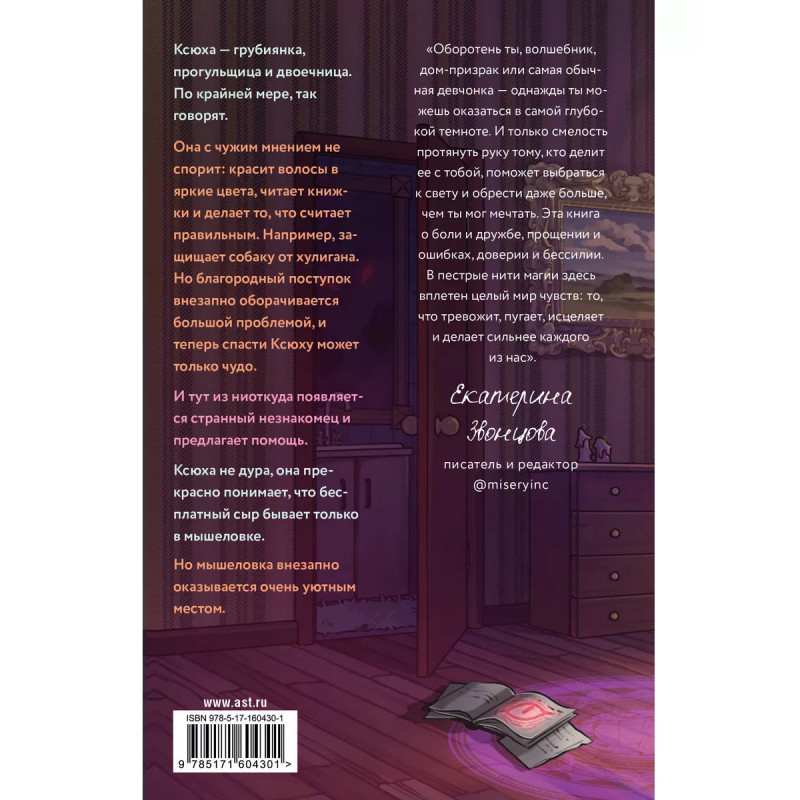 Яркое городское фэнтези в духе "Ходячий замок Хаула" Дианы У. Джонс! Своеобразный ретеллинг "Красной шапочки" для поклонников Мариссы Мейер и Мэгги Стивотер. Книга о том, как быть человеком. Даже если ты оборотень, маг или боггарт. Люди говорят, Ксюха - проблемный подросток. Она прогуливает школу, грубит взрослым, учится на двойки, и волосы у нее вечно слишком ярких цветов! Сама Ксюха с ними не спорит. Она живет так, как считает нужным, и поступает так, как велит сердце. Например, защищает собаку от хулигана. Но и этот благородный поступок выходит боком: Ксюха случайно разбивает мальчишке телефон и остается должна ему денег. Спасти ее теперь может лишь чудо. Вдруг из ниоткуда появляется таинственный незнакомец - добрый фей, который предлагает помощь. Ксюха чувствует: что-то не так, но все равно соглашается и попадает в удивительный мир. В этом мире есть магия, оборотни и даже Дом оказывается живым существом! Надо сказать, с весьма скверным характером. Но на этом странности только начинаются. И Ксюха прекрасн