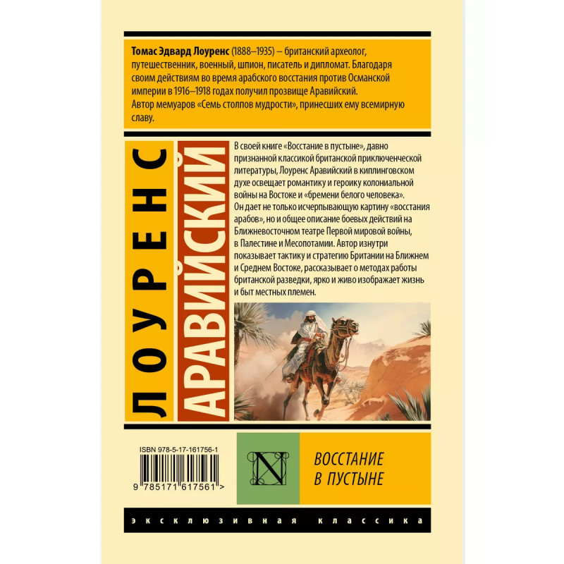 Томас Эдвард Лоуренс (1888-1935) - британский археолог, путешественник, военный, шпион, писатель и дипломат. Благодаря своим действиям во время арабского восстания против Османской империи в 1916-1918 годах получил прозвище Аравийский. Автор мемуаров "Семь столпов мудрости", принесших ему всемирную славу. В своей книге "Восстание в пустыне", давно признанной классикой британской приключенческой литературы, Лоуренс Аравийский в киплинговском духе освещает романтику и героику колониальной войны на Востоке и "бремени белого человека". Он дает не только исчерпывающую картину "восстания арабов", но и общее описание боевых действий на Ближневосточном театре Первой мировой войны, в Палестине и Месопотамии. Автор изнутри показывает тактику и стратегию Британии на Ближнем и Среднем Востоке, рассказывает о методах работы британской разведки, ярко и живо изображает жизнь и быт местных племен.