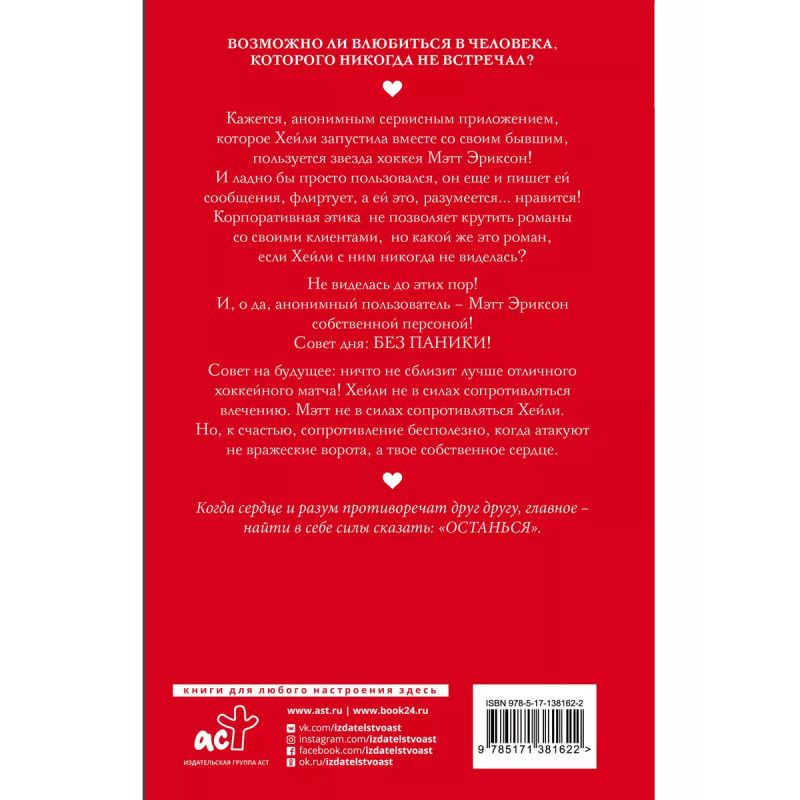 Останься. Кажется, анонимным сервисным приложением, которое Хейли запустила вместе со своим бывшим, пользуется звезда хоккея Мэтт Эриксон! И ладно бы просто пользовался, он еще и пишет ей сообщения, флиртует, а ей это, разумеется нравится! Корпоративная этика не позволяет крутить романы со своими клиентами, но какой же это роман, если Хейли с ним никогда не виделась? Не виделась до этих пор! И, о да, анонимный пользователь - Мэтт Эриксон собственной персоной! Совет дня: БЕЗ ПАНИКИ! Совет на будущее: ничто не сблизит лучше отличного хоккейного матча! Хейли не в силах сопротивляться влечению. Мэтт не в силах сопротивляться Хейли. Но, к счастью, сопротивление бесполезно, когда атакуют не вражеские ворота, а твое собственное сердце.