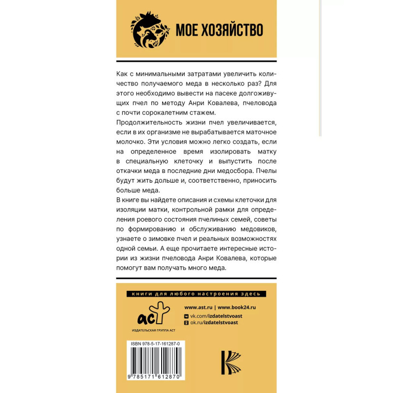 Много меда. Долгоживущие пчелы по методу Ковалева. Анри Ковалев, пчеловод с более чем тридцатилетним опытом, разработал собственный метод по выводу долгоживущих пчел на любой пасеке. Ему удалось создать уникальный способ работы с пчелами, с помощью которого с минимальными затратами можно увеличить количество получаемого меда в несколько раз. В книге "Долгоживущие пчелы. Метод Ковалева" вы найдете схему и подробные описания клеточки, которая позволяет изолировать матку на срок до трех месяцев, при этом сохраняя ее максимальную производительность. Автор делится секретами создания контрольной рамки, ульев, работы с медовиками, зимовки пчел и рассказывает интересные истории из практики. Книга в мягкой обложке подойдет для опытных и начинающих пчеловодов. Метод Ковалева Анри позволит легко и продуктивно работать на пасеке.